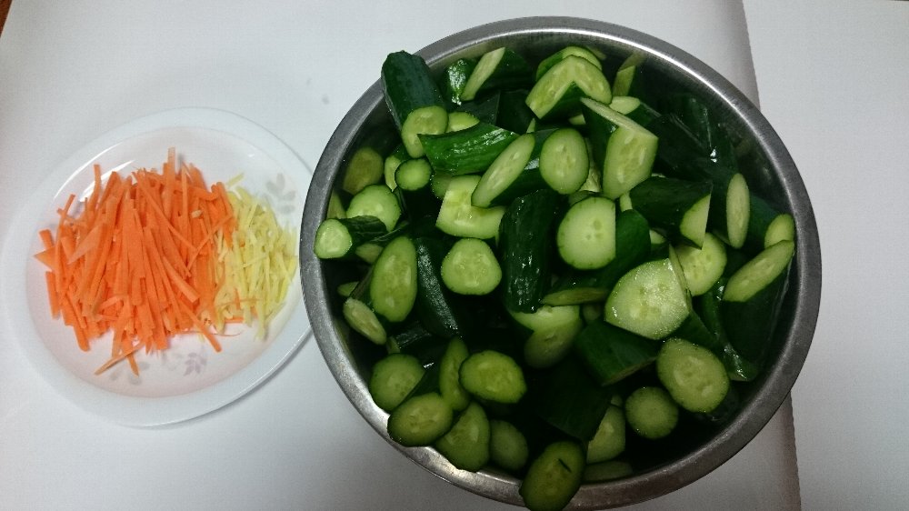 ① きゅうりは乱切り、にんじん、しょうがは千切りにします。
